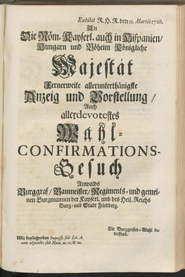 Aus Denen in dem Burg-Friedbergischen Archiv befindlichen Actis, Protocollis und Documentis extrahirte, denen Reichs-fundamental-Gesätzen und Friedens-Schluessen, Kayserlichen Privilegien, unter alleerseits Religions-Verwandten Herren Mit-Gliedern der Kayserl. Burg errichteten Pactis, Capitulationibus, darueber erstatteten Juramentis und unverruckter Observanz gemäße gruendliche Information, Den Religions-Zustand und Beschaffenheit der Kayserl. und des Heil. Reichs Burg Friedberg in der Wetterau betreffend