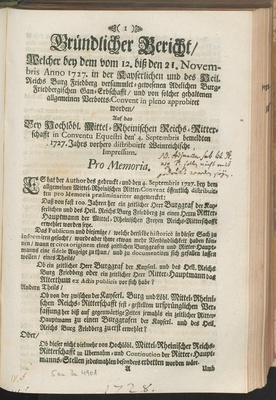 Gründlicher Bericht, welcher bey dem vom 12. biß den 21. Novembris Anno 1727. in der Kayserlichen und des Heil. Reichs Burg Friedberg versammlet-gewesenen Adelichen Burg-Friedbergischen Gan-Erbschafft, und von solcher gehaltenen allgemeinen Verbotts-Convent in pleno approbiret worden : Auf das ... in Conventu Equestri den 4. Septembris bemeldten 1727 ... Impressum ; Pro Memoria