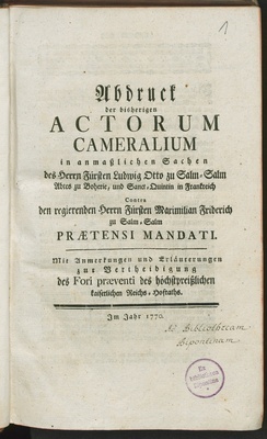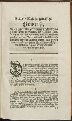Reichs-Verfassungsmässiger Beweis, daß dem regierenden Herrn Fürsten Ludwig Otto zu Salm-Salm die Ausübung des Hochfürstl. Salm-Salmischen Siz- und Stimmrechts auf der Reichsversammlung und dem Oberrheinischen Crays gebühre, und Demselben weder sein geistlicher Stand, noch der von seinem Herrn Bruder Prinzen Maximilian vorgeschüzte Besiz sothanen Siz- und Stimmrechts im mindestem im Weeg stehe.