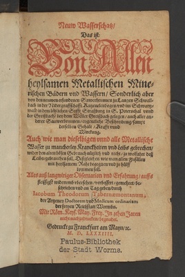 Neuw Wasserschatz Das ist: Von Allen heylsamen Metallischen Minerischen Bädern vnd Wassern Sonderlich aber von den neuwen erfundenen Sawerbrunnen zu Langen Schwallbach in der Nidergraffschafft Katzenelenbogen vnd im Schwartzwald in dem loeblichen Stifft Straßburg in S.Petersthal vnnd der Greißbach bey dem Weiler Greißbach gelegen auch aller anderer Sauwerbrunnen eygentliche Beschreibung sampt derselben Gehalt Krafft vnnd Wirckung. ... Alles auß langwiriger Obseruation vnd Erfahrung auffs fleissigst widerumb vbersehen verbessert gemehret beschrieben vnd an Tag geben / durch Iacobum Theodorum Tabernaemontanum, der Artzeney Doctorem vnd Medicum ordinarium der freyen Reichstatt Wormbs.