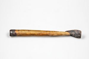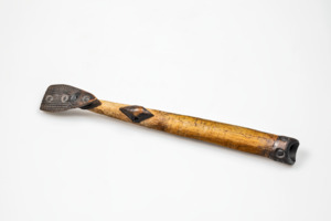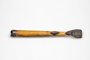 Holzflöte mit verziertem keilförmigem Kopf, am Schaft ein durchbohrter "Buckel", eingebrannte Farbkontraste an Schaftende, Kopf und Buckel, Ritzverzierung, Brandverzierung, Druckverzierung