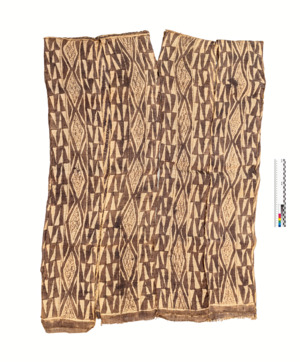 Gewand aus acht miteinander verflochtenen Bastbahnen, Brandmuster, meist Rauten oder Streifen