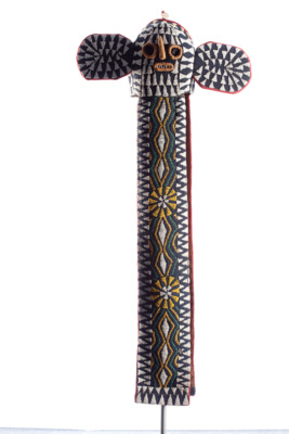 Elefantenmaske der Kuo'si-Gesellschaft, Teil eines aufwändigen Kostüms mit Hut und großem Gewand; bei wichtigen Ritualen, Festlichkeiten und Trauerfeiern für politisch hochrangige Mitglieder des Königreichs getragen. Perlenstickerei auf Stoff, zahlreiche Ornamente aus vornehmlich weißen Perlen. Beim Tragen bleiben nur die Augen frei. Mund, Nase und Augen mit braunem Stoff angedeutet.