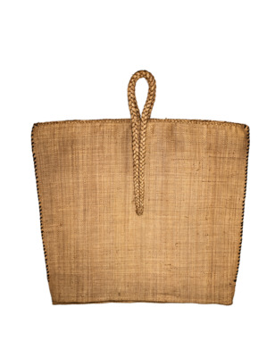 Tasche aus zwei an den Rändern verflochtenen Teilstücken, beidseitig eingearbeitete Bastzöpfe, die an den Enden zusammengeflochten sind; bilden den Tragegriff