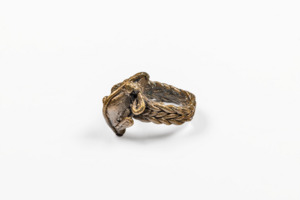 flacher Ring in der Struktur eines Flechtgewebes; Ringaufsatz: geschwungene, halbrunde Form mit vier "Schlingen", vermutlich Chamäleon-Darstellung