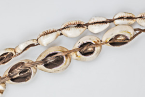 Kette aus 40 an einer Bastschnur der Größe nach aufgefädelte Kaurischnecken. Kaurischnecken wurden auch als Zahlungsmittel verwendet