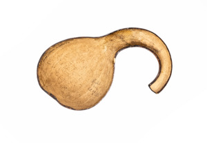 Schale mit gebogenem Stiel und diversen Brandritzmustern auf der Außenseite, zum Rand hin abgeschlossen durch einen Ring aus Mustern, die vermutlich Kaurischnecken darstellen