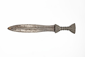 Holzgriff vermutlich mit Eisendraht überzogen, Klinge aus Eisen; Griff: sanduhrförmig (2 Dreiecke verbunden mit einem Mittelstiel); Griff: Druckverzierung, Ritzverzierung