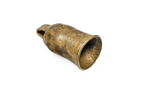 Gelbguß; als Klöppel dient eine an einem blauen Baumwollstreifen aufgehängte Kaurischnecke; an den Seiten unmittelbar an der Befestigungsstelle des Aufhängers jeweils 5 spiralförmige Kreismuster