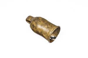 Gelbguß; als Klöppel dient eine an einem blauen Baumwollstreifen aufgehängte Kaurischnecke; an den Seiten unmittelbar an der Befestigungsstelle des Aufhängers jeweils 5 spiralförmige Kreismuster