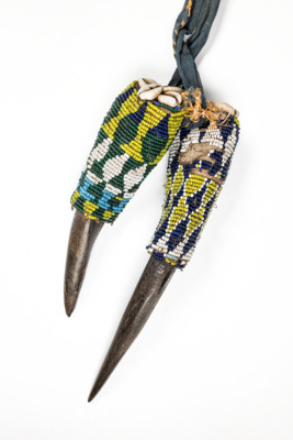 2 Hörner als Anhänger an einem Stoffband, zur Hälfte mit perlenbesetztem Stoff (bunte Perlen in Rautenmuster) überzogen. Eine Bastschnur hält Band und Hörner zusammen. Amulette sollen Schutz und Kraft verleihen; Kaurischnecken können auf Reichtum und Fruchtbarkeit verweisen.