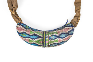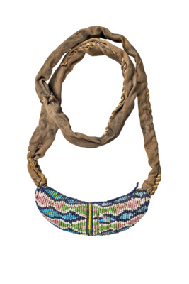 Außenseitig perlenüberzogenes Amulett in der Form einer längs aufgeschnittenen Banane, fließend in das Umhängeband eingenäht. Amulette sollen Schutz und Kraft verleihen. Rautenmuster (Form von Kaurischnecken?) können auf Reichtum und Fruchtbarkeit verweisen.