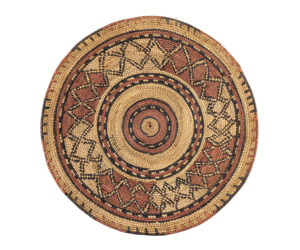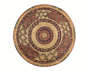 aus Bast geflochtener mehrfarbiger runder Deckel; Farben: rot, blau, natur; Rand mit Rautenmuster verziert und mit zweifarbigem Bast umstickt