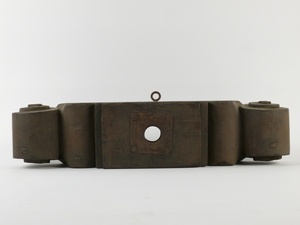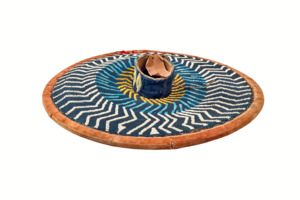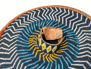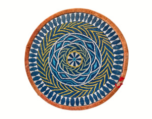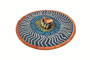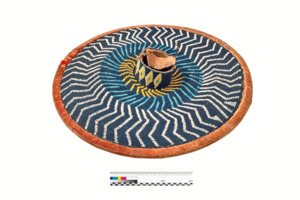 Runde Scheibe mit Kopfring, mit dunkelblauen Stoff überzogen, Scheibe mit einem roten Samtband eingefasst; Ober- und Unterseite von Scheibe und Vorderseite von Ring mit Perlen (rund und länglich) bestickt (weiß, blau, gelb). Gehörte zum Ensemble der Elefantenmaske.