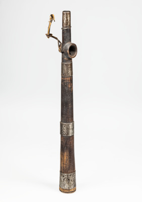 dunkelbraunes Holzrohr, zylinderförmig zulaufend, mit vier Eisenbändern umschlagen, am schmaleren Ende mit runder überstehender Mundöffnung versehen; ein Lederriemen (mit Fellresten) unterhalb der Blasstücks