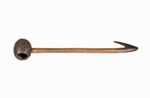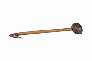 Griff mit angespitztem Haken aus Astgabel, Kokosnuss (hohl, aufgeschnitten, ausgeschabt) auf Griff aufgesteckt, diente zum Schöpfen von Flüssigkeiten