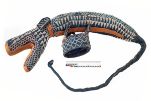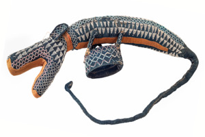 Tanzaufsatz in Form eines Leoparden, dunkelblauer Stoff (indigogefärbt?) mit blauen, weißen und roten Glasperlen bestickt, "Körper" ist ausgestopft, möglicherweise mit Stroh oder Gras.