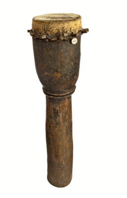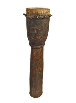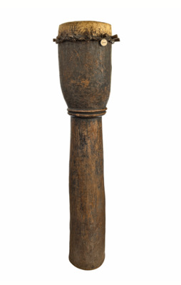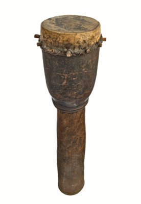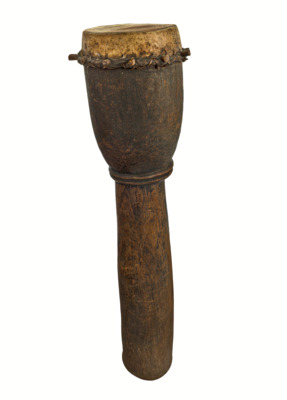 Holztrommel, tailliert, mit Tierhaut bespannt, Schlägel dabei (nicht vorhanden; vielleicht Schlägel von 2361)