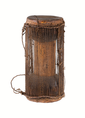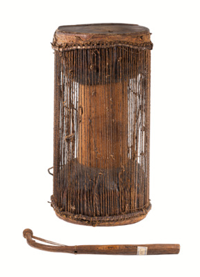 mit Tierhaut bespannt, Spannschnüre bis zum Boden, mit Schlägel und seitlicher Schlaufe