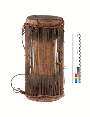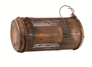 mit Tierhaut bespannt, Spannschnüre bis zum Boden, mit Schlägel und seitlicher Schlaufe