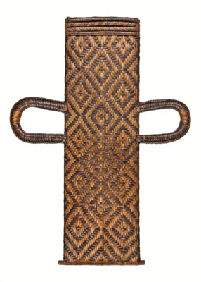 Scheide aus Palmholz mit geflochtener Liane umwickelt, seitlich jeweils ein Griff, hell-dunkles Rautenmuster