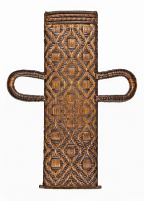 Scheide aus Palmholz mit geflochtener Liane umwickelt, seitlich jeweils ein Griff, hell-dunkles Rautenmuster