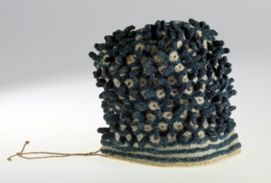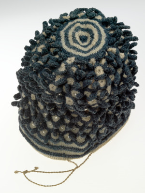 blau-weiße von oben nach unten durchgehäkelte Mütze mit blauen Noppen und weißen Kreisen, unterer Rand blau-weiß gestreift, Kordel zum Zuziehen der Mütze eingezogen