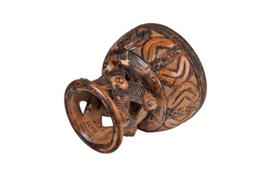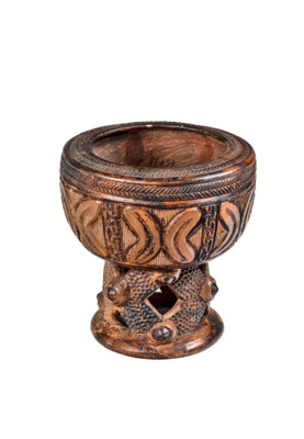 kelchartige Tonschale auf Sockel, Verzierung am hohlen Sockel (mit Quadraten durchbrochen), Halbkugeln an Schnittstellen aufgesetzt, Schale mit sichelförmigen Symbolen verziert, bandförmige Verzierungen am oberen Rand