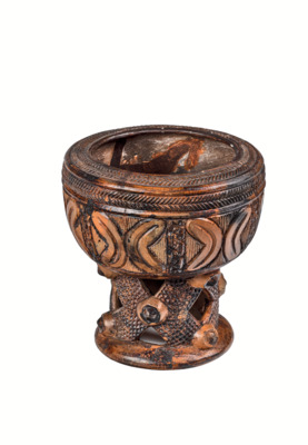 kelchartige Tonschale auf Sockel, Verzierung am hohlen Sockel (mit Quadraten durchbrochen), Halbkugeln an Schnittstellen aufgesetzt, Schale mit sichelförmigen Symbolen verziert, bandförmige Verzierungen am oberen Rand