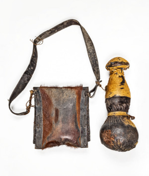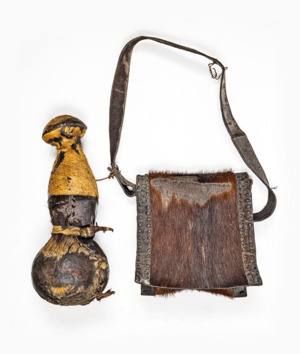 Jagdtasche mit angehängter Pulverflasche aus einem mit Leder überzogenen Flaschenkürbis