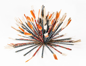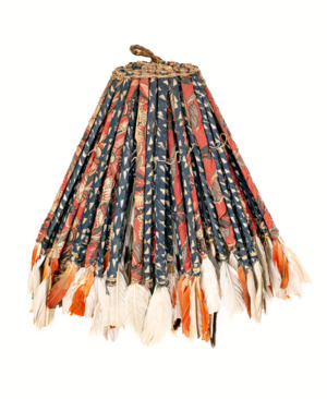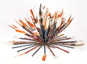 Bündel aus in konzentrischen Kreisen angeordneten, mit Stoffstreifen umwickelte Holzstäbchen, jeweils eine rote oder weiße Feder an der Spitze, Stäbe eines Kreises mit Schnur verbunden, Schlaufe an Unterseite