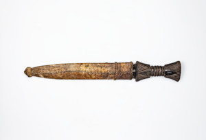 Dolch mit geschnitztem Holzgriff, Scheide aus Leder