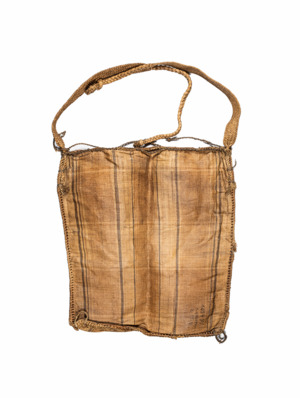 Tasche aus gefärbtem Raphiabast; gewebt; mit geflochtenen Fasern umrandet; Schlaufen an den unteren Ecken; geflochtener Trageriemen aus zwei Teilen; farblich abgesetzte Linien