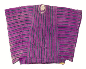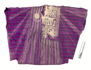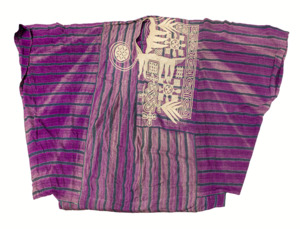 Tobe aus magentafarbenem Stoff, mit blau-weißen Streifen, aus Streifen genäht, linke Brustseite mit großer Tasche sowie gesticktem Muster auf der Brustseite, verstärkter Halsausschnitt