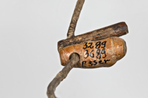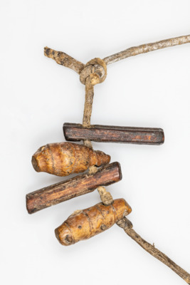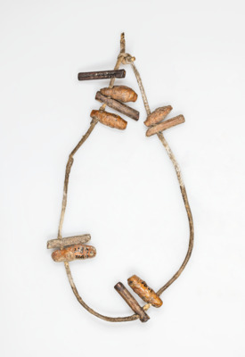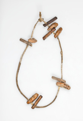 10 unterschiedliche Holzstückchen verschiedener Größe in Abständen lose auf Lederband gefädelt