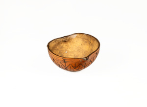Halbrunde Kalabasse, außen mit großen Brandritzornamenten