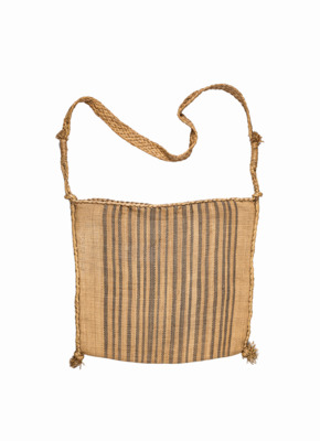 Tasche aus gefärbten Raphiafasern, farblich abgehobenes Streifenmuster, mit geflochtenem Bast umrandet (außer unterem Rand), Trageriemen aus geflochtenen Raphiafasern