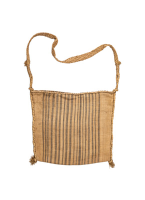 Tasche aus gefärbten Raphiafasern, farblich abgehobenes Streifenmuster, mit geflochtenem Bast umrandet (außer unterem Rand), Trageriemen aus geflochtenen Raphiafasern