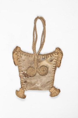 aus Pflanzenfasern geflochtene Tasche umnäht mit Leder, zwei geflochtene Träger