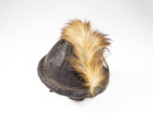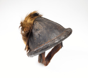 annähernd kegelförmig, ovale Grundform, geflochtene Lederkordel läuft von vorne nach hinten über den Helm, hinten Pelzbusch vom Rand bis zur Mitte, Kinnriemen aus dunklem Fell, Schnur zur Aufhängung an der Spitze, innen offenes Flechtwerk