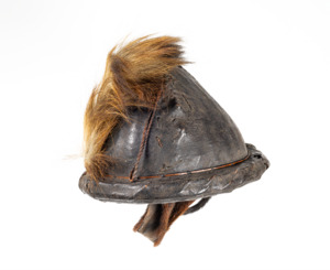 annähernd kegelförmig, ovale Grundform, geflochtene Lederkordel läuft von vorne nach hinten über den Helm, hinten Pelzbusch vom Rand bis zur Mitte, Kinnriemen aus dunklem Fell, Schnur zur Aufhängung an der Spitze, innen offenes Flechtwerk