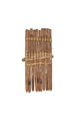 zehn Stäbchen, nebeneinander angeordnet, mit Pflanzenfaser umwickelt; zwei kleinere Querstäbchen geben der Konstruktion Halt; die einzelnen Stäbchen weisen eine geschnitzte Spitze auf