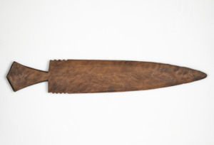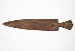 dunkelbraunes Holz, messerförmig, flach mit scharfer Spitze, Einkerbungen an der Seite des Holzblatts