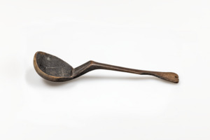 dunkelbrauner Holzlöffel mit schmalem Stiel, am Stielansatz mit feinem Rillenmuster verziert, zum Ende hin breiter zulaufend