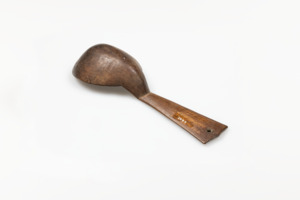 dunkelbrauner grosser Löffel, aus Holz geschnitzt, Rillenmuster auf Stiel