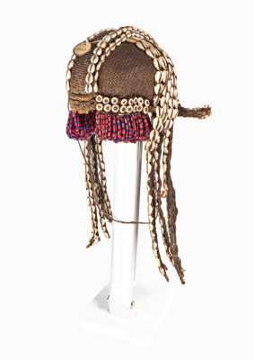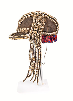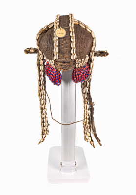 geflochtener Basthut mit Schild am hinteren Ende, durch Holzstäbchen gestärkt, Kammaufsatz (längs) aus Bast, Muschelband quer, in Zöpfen endend (5 pro Seite; ca. 30 cm lang), Stirn mit Glasperlenschlaufen besetzt (rot und blau), darüber zweireihige Knopfleiste