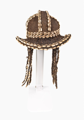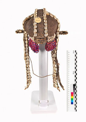 geflochtener Basthut mit Schild am hinteren Ende, durch Holzstäbchen gestärkt, Kammaufsatz (längs) aus Bast, Muschelband quer, in Zöpfen endend (5 pro Seite; ca. 30 cm lang), Stirn mit Glasperlenschlaufen besetzt (rot und blau), darüber zweireihige Knopfleiste