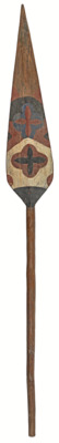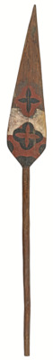 spitz zulaufendes, bemaltes Paddel, Bemalung des vorderen Teils in schwarz, rot und weiß