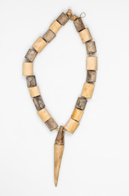 20 Holzringe in hellem und dunklem Farbton, in der Mitte ein spitzes Stück Holz in Form eines Horns, auf grobe Schnur gefädelt