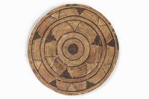 runder Bastdeckel mit zweifarbig geometrischen Mustern, die sich in Kreisen anordnen, sechs Dreiecke erste Peripherie, zehn Dreiecke zweite Peripherie (dunkelblau, dunkelrot)